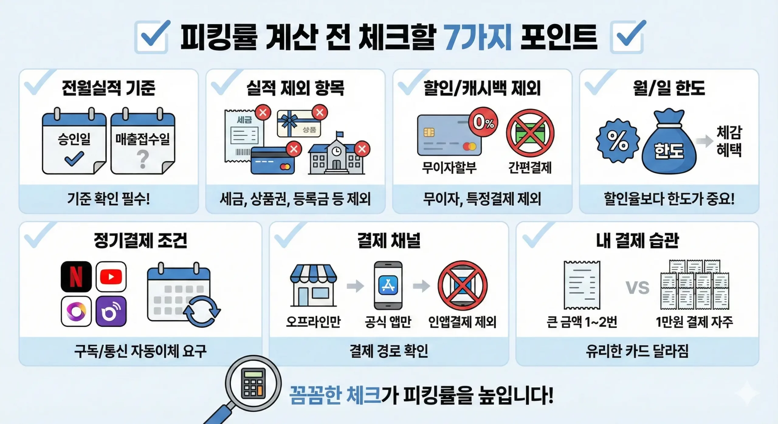 카드 혜택은 보통 “최대 기준”으로 적혀 있습니다. 하지만 실제로는 아래 3개가 피킹률을 깎아요.