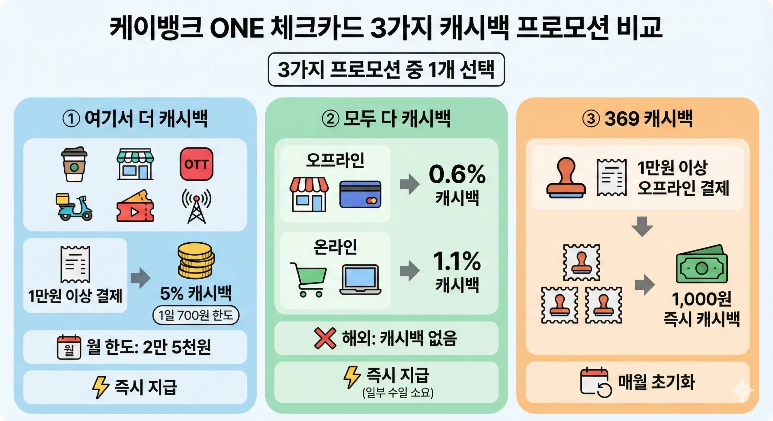 케이뱅크 ONE 체크카드는 캐시백 프로모션 3가지 중 1개를 선택해서 쓰는 구조입니다.