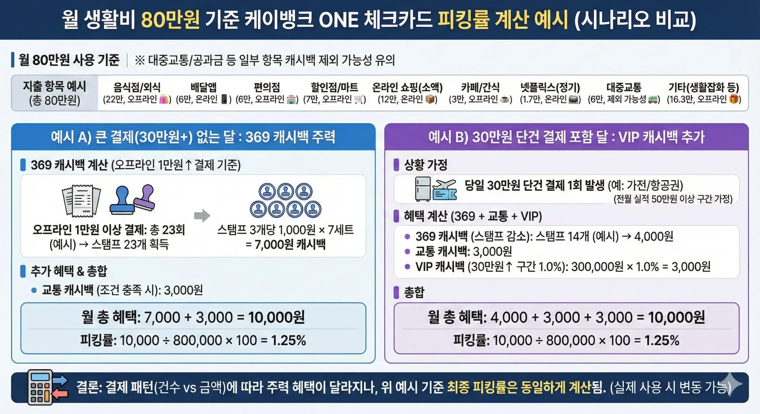 단, 카드사 정책상 대중교통/공과금/상품권/충전 등은 캐시백 제외가 걸릴 수 있어 실제 수치는 더 낮아질 수 있습니다.