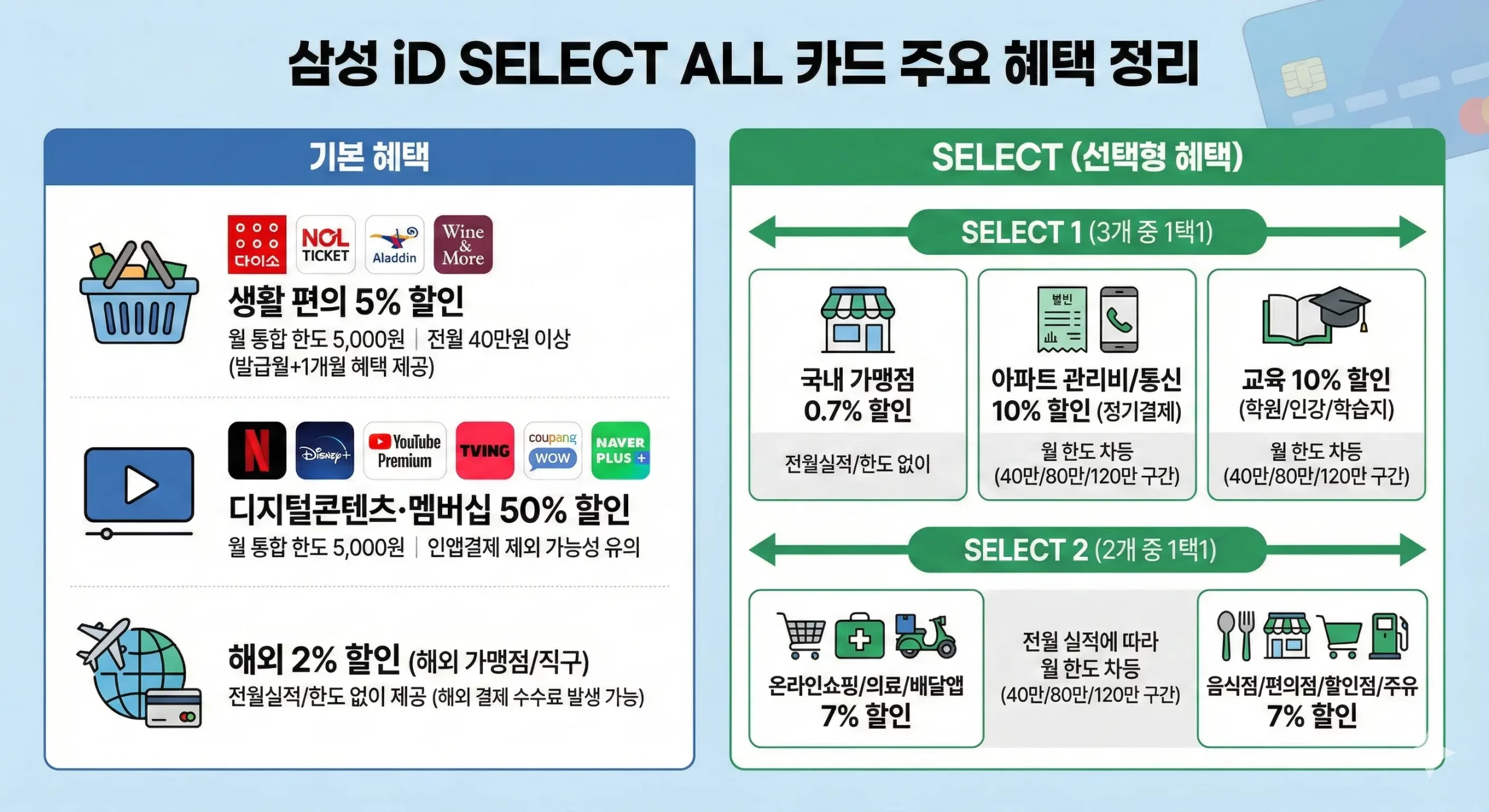 ④ SELECT1(3개 중 1택1) : 국내 가맹점 0.7% (전월실적/한도 없이, 중복 할인은 큰 혜택만 적용)