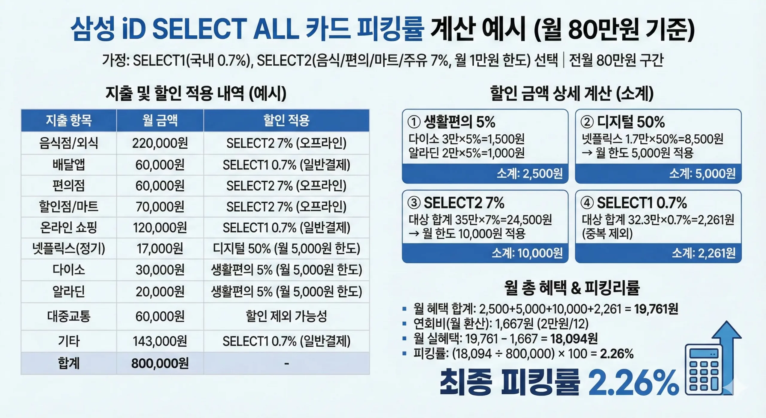 아래 예시는 “SELECT1은 국내 0.7%”, “SELECT2는 음식점/편의점/할인점/주유 7%”를 선택했다는 가정으로 계산했습니다.